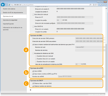 Seleccione la casilla de verificación para utilizar el mismo nombre de mDNS que en IPv4. Para configurar un nombre diferente, quite la marca de la casilla de verificación e introduzca el nombre de mDNS en el cuadro de texto [Nombre de mDNS]. [Opciones de DHCP][Obtener direc. servidor DNS]
