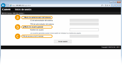 Puede realizar todas las operaciones y configuraciones de la IU remota. Si hay especificado un ID de administrador del sistema, introduzca el ID adecuado en [ID del administrador del sistema] y el PIN correspondiente en [PIN del administrador del sistema].
