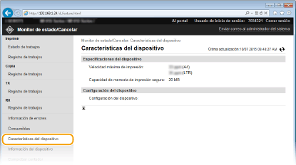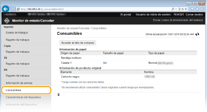 Se muestra información sobre el tamaño y el tipo de papel para el origen del papel, el número de modelo del cartucho de tóner, etc. También podrá hacer clic en [Comprobar detalles de consumibles] en