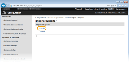 Cargue (importe) los datos que se exportaron desde el equipo. También podrá importar datos de configuración de otro equipo si se tratara del mismo modelo que el suyo.
