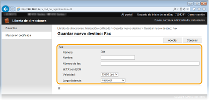 También podrá especificar [TX con ECM] y [Velocidad] desde <Opciones de fax> ( Opciones de fax (MF419x / MF416dw)) en el panel de control. No obstante, los ajustes realizados desde <Libreta dir.> se habilitarán para las opciones detalladas de destinos registrados en la libreta de direcciones.