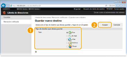 Seleccione [Tipo de destino que desea guardar] y haga clic en [Aceptar].