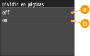 Si selecciona JPEG en <Formato de archivo> e intenta leer un documento desde el cristal de la platina, únicamente podrá leerse una página. Para leer un documento de varias páginas deberá usar el alimentador. Cada página del documento se guarda como un archivo independiente. Si selecciona TIFF o PDF, podrá leer documentos de varias páginas desde el cristal de la platina o desde el alimentador. En tal caso, puede consultar División de un documento en varios archivos página por página para especificar si todo el documento leído debe guardarse como un solo archivo o como varios archivos, página por página.