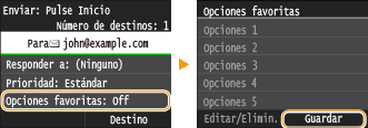 Para editar o eliminar opciones registradas, entre en <Lectura>  <E-mail>/<I-fax>/<Archivo>  <Opciones favoritas>  <Editar/Elimin.>  <Editar> o <Eliminar> y siga los pasos descritos a continuación.