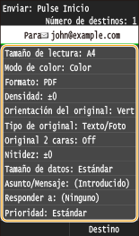 Las opciones registradas pueden visualizarse cuando sea necesario, por lo que no se necesitarán procedimientos complicados (por ejemplo, configurar el tipo de documento, especificar PDF compacto como formato de archivo y enviar el archivo a todo el personal interno) cada vez. También podrá asignar combinaciones de opciones registradas a un botón de acceso directo mostrado en la pantalla Inicio.