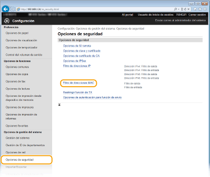 Si las direcciones MAC se introducen de forma incorrecta, es posible que no pueda acceder al equipo desde la IU Remota, en cuyo caso deberá establecer <Filtro de direcciones MAC> en <Off>. Filtro de direcciones MAC