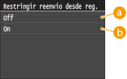 Prohíbe la especificación de destinos de los registros de transmisión. La utilización de esta restricción impide que se seleccionen destinos de los registros de transmisión para "Enviar fax", "Leer y enviar como e-mail" y "Leer y guardar en una carpeta compartida o un servidor FTP".