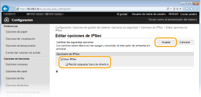 Uso del panel de controlTambién podrá activar o desactivar la comunicación IPSec desde <Menú> en la pantalla Inicio. Usar IPSec