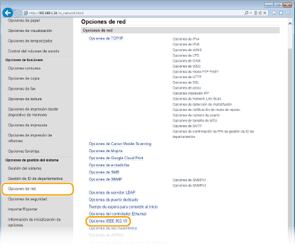 Uso del panel de controlTambién podrá activar o desactivar la autenticación IEEE 802.1X desde <Menú> en la pantalla Inicio. Opciones IEEE 802.1X