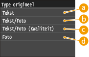 U kunt de optische beeldkwaliteit voor de kopie selecteren op basis van het documenttype, zoals documenten met alleen tekst, documenten met grafieken en tabellen of documenten met tijdschriftfoto's.