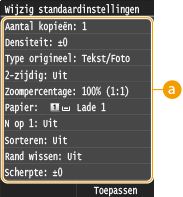 drukt. Als u deze standaardinstellingen afstemt op de bewerkingen die u regelmatig uitvoert, kunt u tijd besparen doordat u niet steeds dezelfde instellingen hoeft te configureren als u gaat kopiëren.