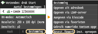 Als u bij stap 2 Groepskiezen hebt opgegeven, verschijnt <Aantal bestemmingen: XX>. Als u op dit item tikt, ziet u hoeveel bestemmingen in de groep zijn opgeslagen.