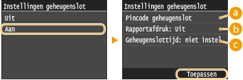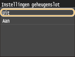 Om ontvangen documenten in het geheugen op te slaan, stelt u <Instellingen geheugenslot> in op <Aan>. U kunt ook optionele instellingen opgeven, zoals het instellen van een wachtwoord om de functie te ontgrendelen. Ook kunt u de periode instellen waarbinnen ontvangen documenten in het geheugen moeten worden opgeslagen.