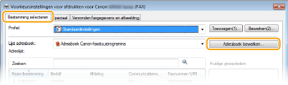 Nadat u veelgebruikte bestemmingen voor faxen die u vanaf de pc stuurt aan het adresboek hebt toegevoegd, kunt u deze bestemmingen eenvoudig opgeven wanneer u vanaf uw pc een fax gaat versturen. U kunt ook adresboekgegevens in de indeling CSV uit andere programma's importeren op het apparaat, zoals uit Microsoft Excel. Omgekeerd kunt u het adresboek ook exporteren naar een bestand voor gebruik op andere faxapparaten of in andere programma's.
