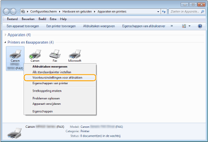 Klik met de rechtermuisknop op het pictogram van het faxstuurprogramma voor dit apparaat en klik op [Voorkeursinstellingen voor afdrukken].