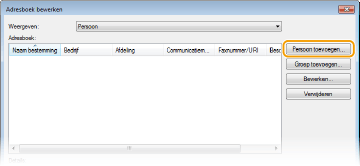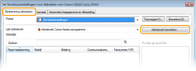 Als u opgeslagen bestemmingen wilt wijzigen of verwijderen, selecteert u een bestemming bij [Adresboek] en klikt u op [Bewerken] of [Verwijderen].