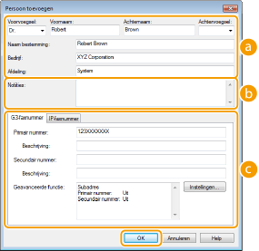Voer een of meer faxnummers in. Typ desgewenst een afbreekstreepje tussen nummers. Als u een toelichting wilt geven voor een faxnummer, zoals 'Thuis' of 'Kantoor', typt u deze bij [Beschrijving].