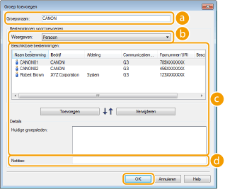 Om een bestemming uit [Huidige groepsleden] te verwijderen, selecteert u deze bestemming en klikt u op [Verwijderen].