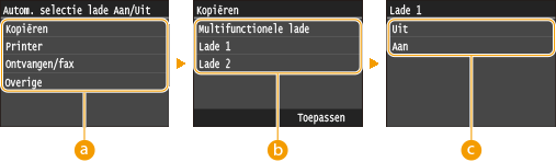 Selecteer <Aan> om automatische selectie van papierladen in te schakelen voor de papierbron die u in het vorige scherm hebt geselecteerd (