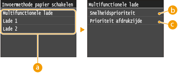 Papier), wordt de optie <Snelheidsprioriteit> gebruikt voor de papierbron. In dat geval moet u het papier laden alsof <Snelheidsprioriteit> is geselecteerd (