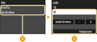 Selecteer het type telefooncentrale dat u gebruikt. Als u <Prefix> selecteert, voert u de code voor het voorvoegsel op het volgende scherm in.