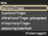 Kies deze optie om instellingen op te geven voor het ontvangen van een fax via een telefoon die is verbonden met de (ontvangst op afstand). Als er een fax naar de machine wordt verstuurd, kunt u deze ontvangen door op de handset van de telefoon een bepaalde code in te voeren. Op deze manier bespaart u tijd en moeite doordat u niet helemaal naar de machine hoeft te lopen. Raadpleeg