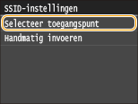 Als u de draadloze verbinding instelt door een draadloze router te selecteren, wordt de WEP-verificatiemethode ingesteld op <Open systeem> of de WPA/WPA2-coderingsmethode op <Automatisch> (AES-CCMP of TKIP). Als u <Gedeelde sleutel> wilt selecteren voor WEP-verificatie of <AES-CCMP> voor codering met WPA/WPA2, moet u de verbinding handmatig instellen ( De verbinding instellen door gedetailleerde instellingen op te geven).