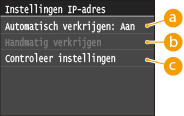 ![]() Als <Aan> wordt weergegeven, tikt u op <Automatisch verkrijgen> en stelt u zowel <Selecteer protocol> als <Auto IP> in op <Uit>.