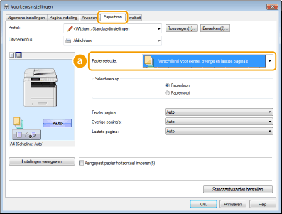 Selecteer de pagina's die u op ander papier wilt afdrukken en de papierbron waarin het papier is geplaatst, bij [Papierselectie]