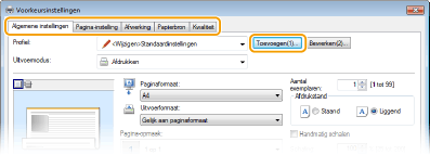 Klik op de tabbladen [Algemene instellingen], [Pagina-instelling], [Afwerking], [Papierbron], of [Kwaliteit] om de afdrukinstellingen op ieder scherm naar behoefte op te geven. Verschillende afdrukinstellingen