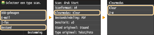 Selecteer <USB-geheugen> of geef een bestemming op met <E-mail>/<Bestand>