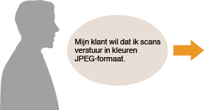 Geef het e-mailadres van uw klant op met <Bestandsindeling> ingesteld op <JPEG> voor scaninstellingen en registreer het adres en instelling als een combinatie in <Favoriete instellingen>. U kunt deze combinatie van instellingen dan altijd eenvoudig oproepen. Veelgebruikte scaninstellingen registreren (E-Mail/I-fax/Gedeelde map/FTP-server)