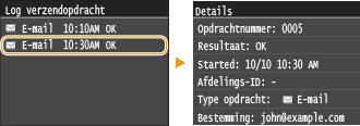 Wanneer <Weergave opdrachtlog> is ingesteld op <Uit>, kunt u de logboeken voor verzonden documenten niet inzien. Weergave opdrachtlog