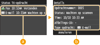<Details>Hier ziet u gedetailleerde gegevens van het document dat u in de lijst hebt geselecteerd. Als u meerdere bestemmingen hebt opgegeven, wordt het aantal opgegeven bestemmingen op het scherm weergegeven. U kunt de gegevens van opgegeven meerdere bestemmingen controleren door te tikken op <Bestemming>.