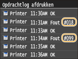 Als er een storing optreedt, bijvoorbeeld als het afdrukken mislukt, u een fax of gescand document niet kunt verzenden of ontvangen, wordt een corresponderende storingscode van drie cijfers weergegeven in een rapport of in het scherm <Opdrachtlog>. Raadpleeg de volgende informatie om voor een foutcode mogelijke oorzaken en oplossingen weer te geven. Als u een foutrapport wilt afdrukken, leest u