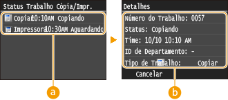 ![]() <Status Trabalho Cópia/Impr.>Apresenta uma lista dos documentos que estão a ser copiados, a ser processados, ou que estão a aguardar processamento.