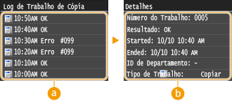 ![]() <Log de Trabalho de Cópia>Apresenta uma lista dos documentos que foram copiados. <OK> aparece quando um documento é copiado com êxito e <Erro> aparece quando um documento não é copiado por ter sido cancelado ou devido a um erro.