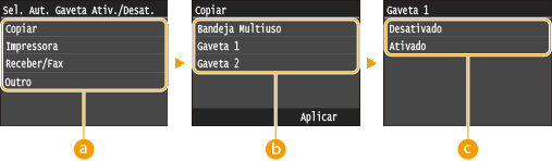 Selecione <Ativado> para ativar a seleção automática de gaveta para a origem de papel selecionada no ecrã anterior (