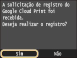 Também pode registar a máquina a partir de um dispositivo móvel ou do Google Chrome*. O visor da máquina apresenta o ecrã de confirmação seguinte antes de o registo ser completado. Prima <Sim> para concluir o registo.