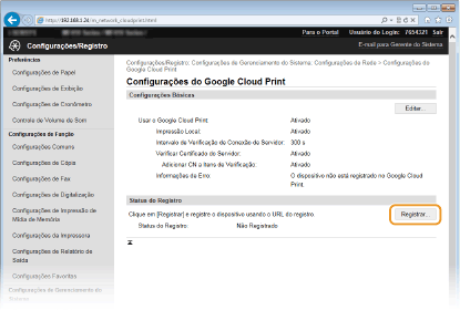 É necessário ativar o Google Cloud Print. Clique em [Editar], selecione a caixa de verificação [Usar o Google Cloud Print] e clique em [OK].