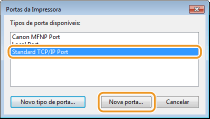 Selecione [Canon MFNP Port] em [Tipos de porta disponíveis] e clique em [Nova porta].