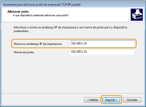 Esta porta permite a deteção automática do endereço IP da máquina. Mesmo que o endereço IP seja modificado, a ligação será mantida, desde que a máquina e o computador estejam na mesma subrede. Não é necessário adicionar uma nova porta sempre que mudar o endereço IP. Se está a utilizar a máquina num ambiente IPv4, deverá escolher este tipo de porta.
