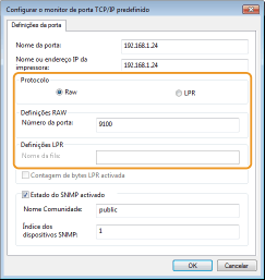 Em [Protocol Type] (Tipo de protocolo), selecione [RAW] ou [LPR] e mude o [Port Number] (Número da porta).
