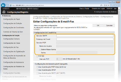 Antes de enviar correio eletrónico ou I-Faxes, utilize a UI Remota para configurar as definições detalhadas de envio e receção, tais como as definições de utilização da máquina para enviar e receber I-Faxes e as definições de autenticação POP e codificação da comunicação. Para obter as definições necessárias, contacte o seu fornecedor ou o administrador da rede.