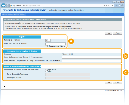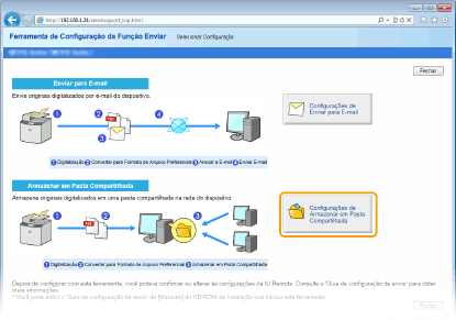 Configurar o SMB). Para configurar a máquina para guardar os documentos digitalizados numa pasta partilhada na rede através de SMB, especifique a localização da pasta partilhada a partir de um computador com antecedência. Esta secção descreve como especificar a localização indicada para armazenamento, utilizando a Ferramenta de Definição da Função de Envio.