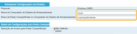 Clique no botão de opção [Não Definido] ou [Definir] para fazer corresponder a definição às restrições de acesso definidas para a pasta partilhada. Se selecionar [Definir], introduza o nome de utilizador na caixa de texto [Nome de Usuário Registrado] e a palavra-passe na caixa de texto [Senha para Acesso].