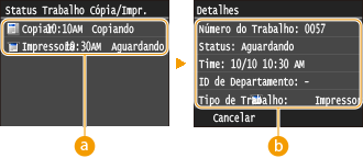 ![]() <Status Trabalho Cópia/Impr.>Apresenta uma lista dos documentos que estão a ser processados, que estão a ser copiados ou que estão a aguardar processamento.
