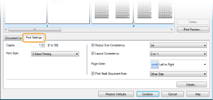 Clique no separador [Print Settings] (Definições de impressão) para aceder ao ecrã utilizado para especificar definições de impressão como, por exemplo, o número de cópias ou impressão de 1 lado/frente e verso. As definições especificadas aqui são aplicadas a todo o trabalho de impressão.