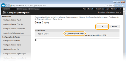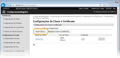 É possível criar um par de chaves com a máquina quando tal for necessário para comunicação codificada através de TLS (Transport Layer Security). Pode utilizar o protocolo TLS quando pretender aceder à máquina através da UI Remota. É possível registar até cinco pares de chaves para a máquina (incluindo os pares pré-instalados). São utilizados certificados auto assinados com pares de chaves gerados em "Comunicação de Rede". Com um "Pedido de Assinatura de Certificado e Chave (CSR)", pode pedir um certificado digital emitido por uma CA para o par de chaves gerado pela máquina.