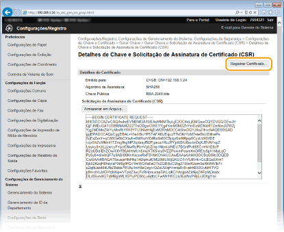 Não pode utilizar o par de chaves gerado pelo Pedido de Assinatura de Certificado (CSR) enquanto o certificado não tiver sido registado. Depois de a autoridade de certificação emitir o certificado, registe-o, seguindo o procedimento abaixo.